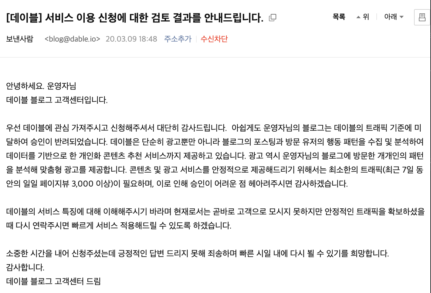 전 아직 #트래픽 기준 미달로 승인 반려되었습니다ㅠㅠ