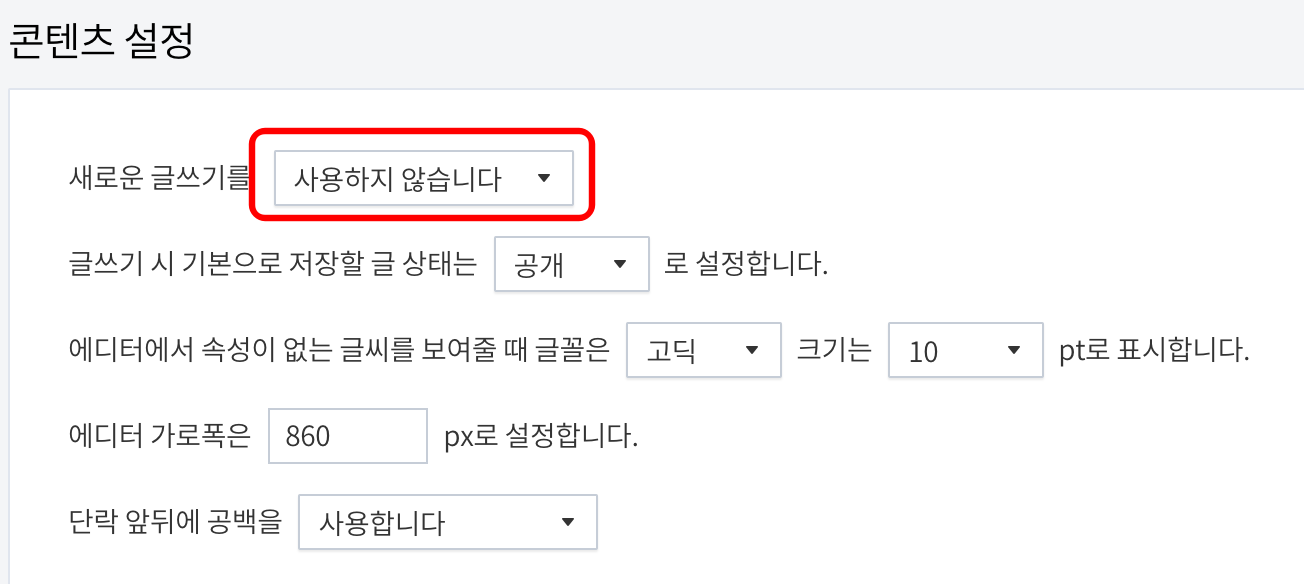 콘텐츠 설정 에 보시면 기본적으로 새로운 글쓰기가 '사용합니다' 로 되어 있으실텐데요. 위와 같이 '사용하지 않습니다' 로 변경해주세요.