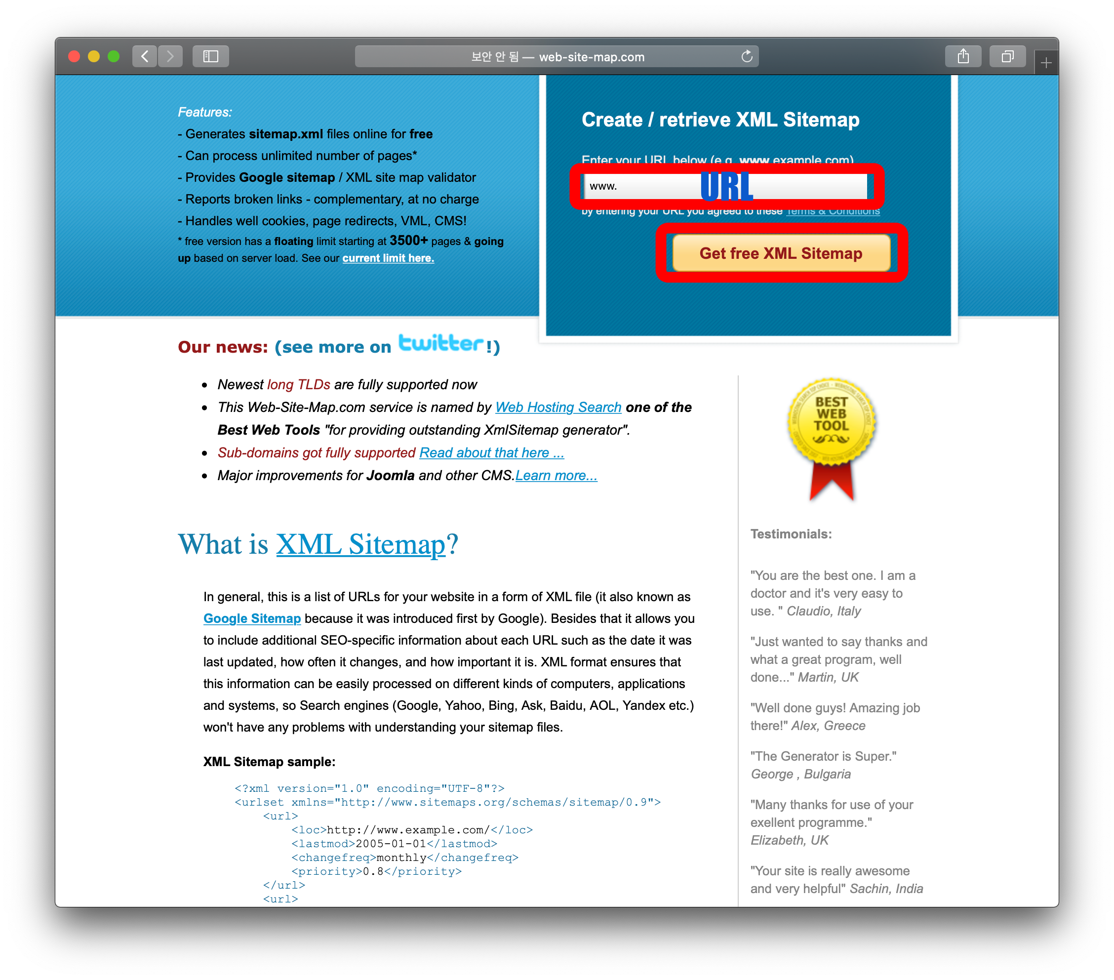 우선 sitemap.xml 파일을 생성해줄 사이트가 있더군요. 검색 결과 찾은 곳은...요깁니다.