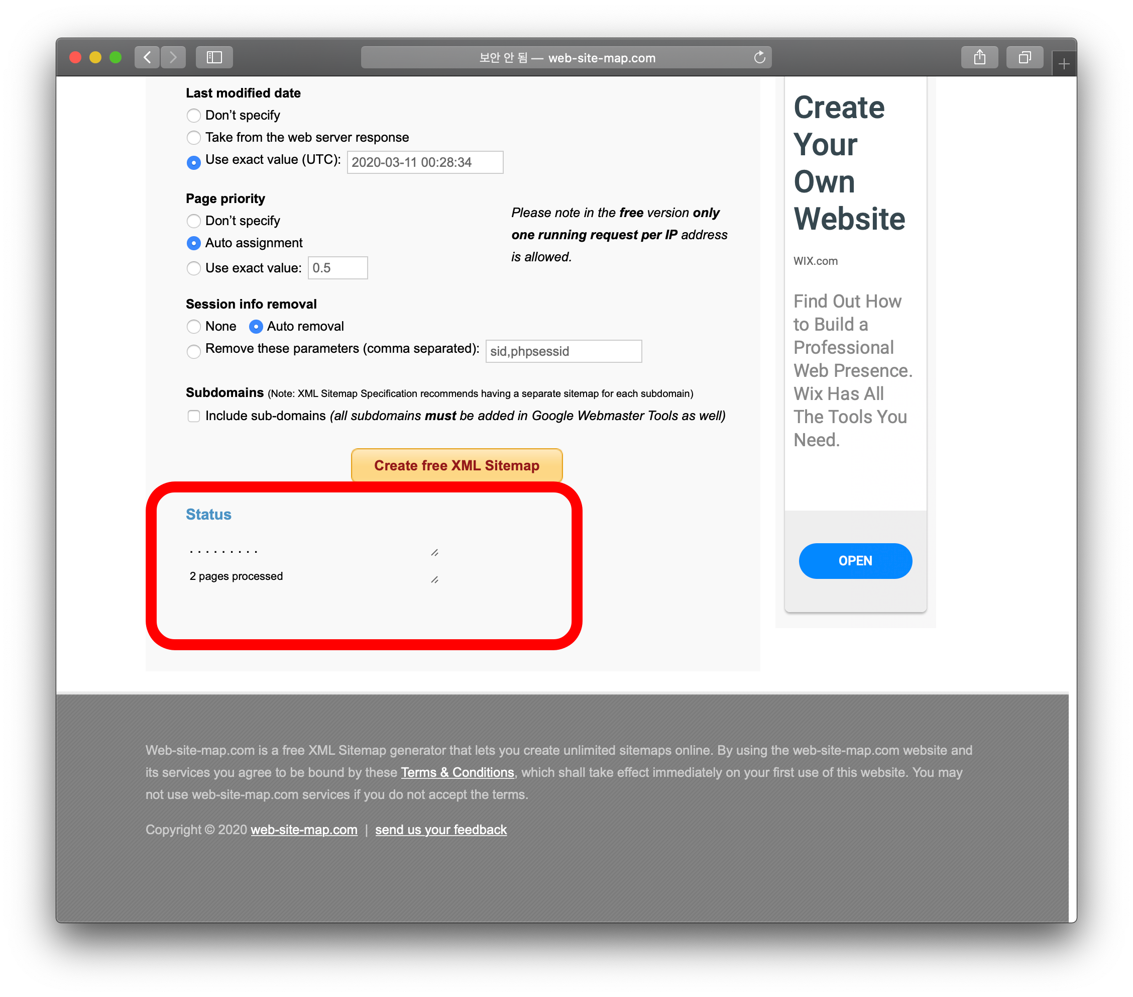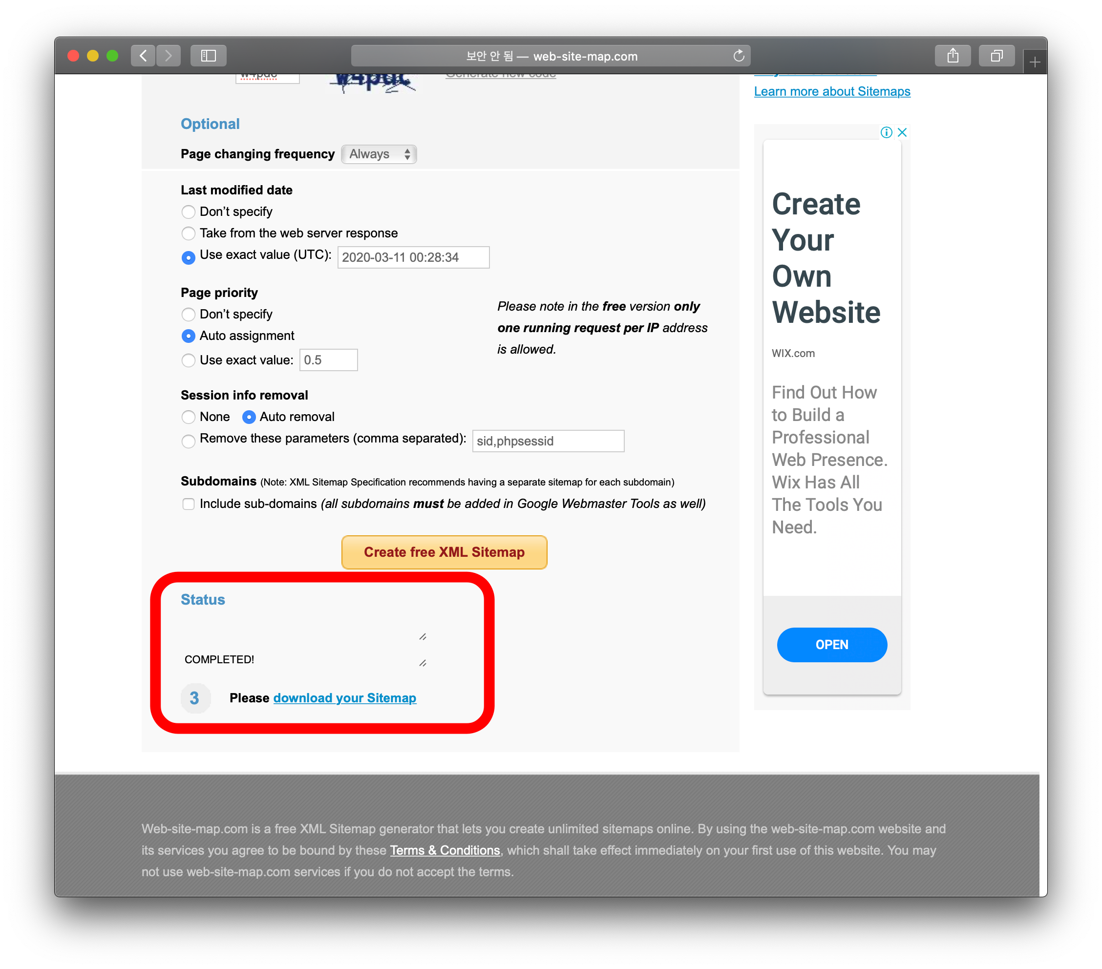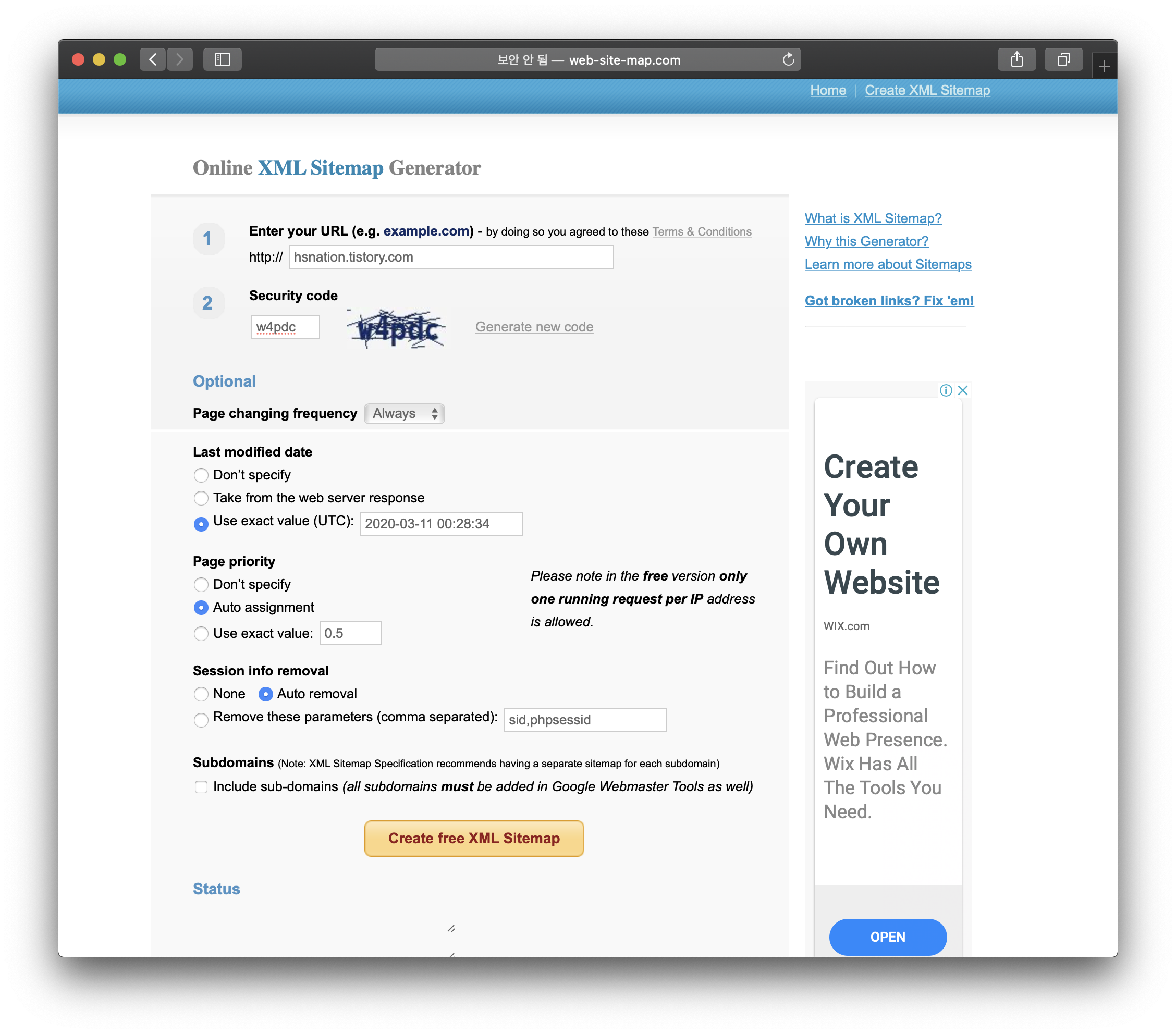 이제 생성을 위해 'Create free XML Sitemap 버튼을 눌러주시면 생성이 된답니다.