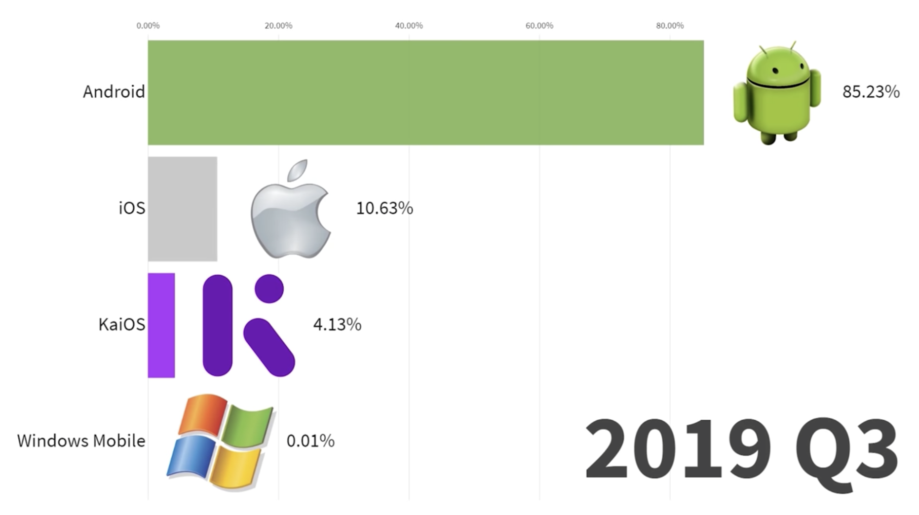 A video shows how Android, iOS and other mobile operating systems jockeyed for positions before ending up in their current positions with 85% of the world's smartphone users sporting an Android phone.