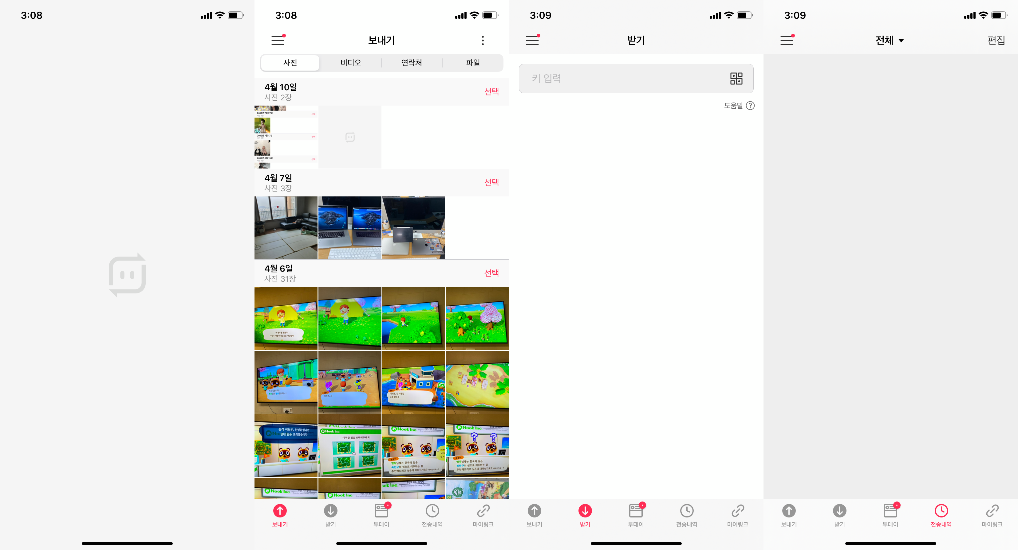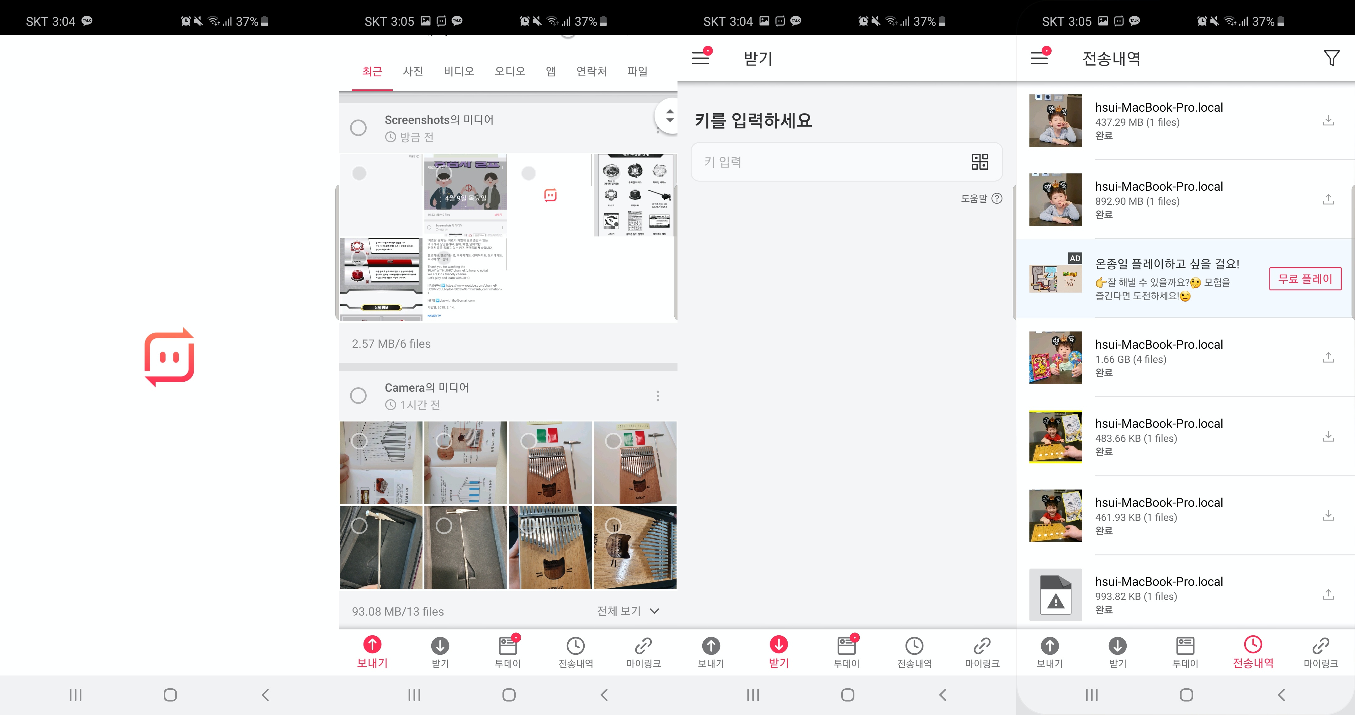 다른 기기에서 받는 기능이고, 전송내역은 그간 전송받았던 리스트를 확인할 수 있어서 어디에 저장했는지