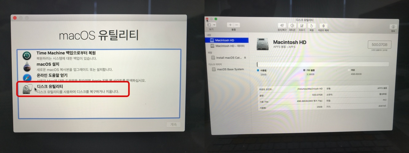 가장 밑에 '디스크 유틸리티' 에 들어가셔서 내장 에 있는 파티션들을 모두 정리해주었어요