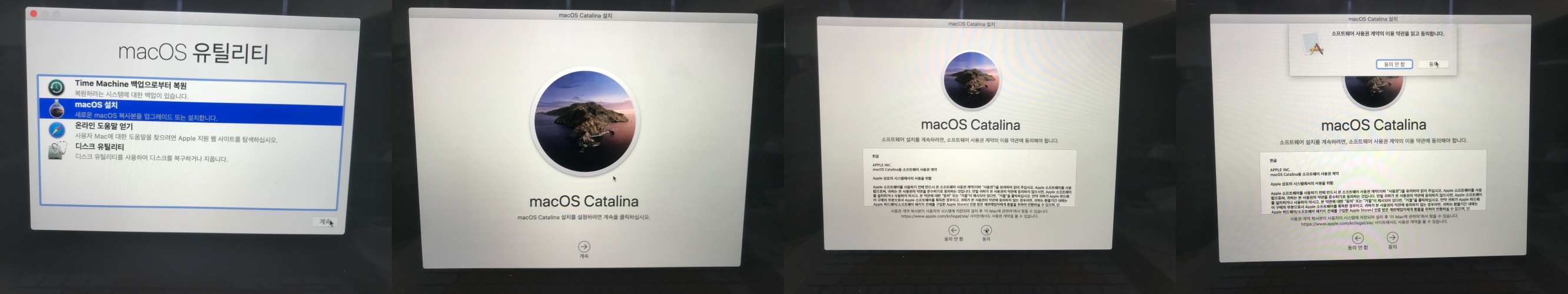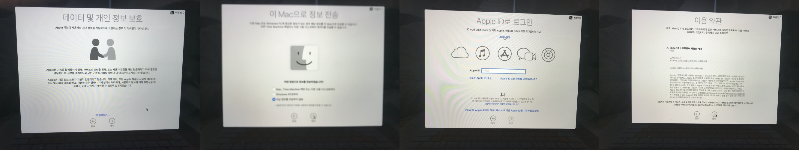 정보 보호는 어쩔껀지...기존 맥이나 윈도우에서 데이터 동기화를 할지...apple id 로그인할지...그리고 이용약관 동의까지