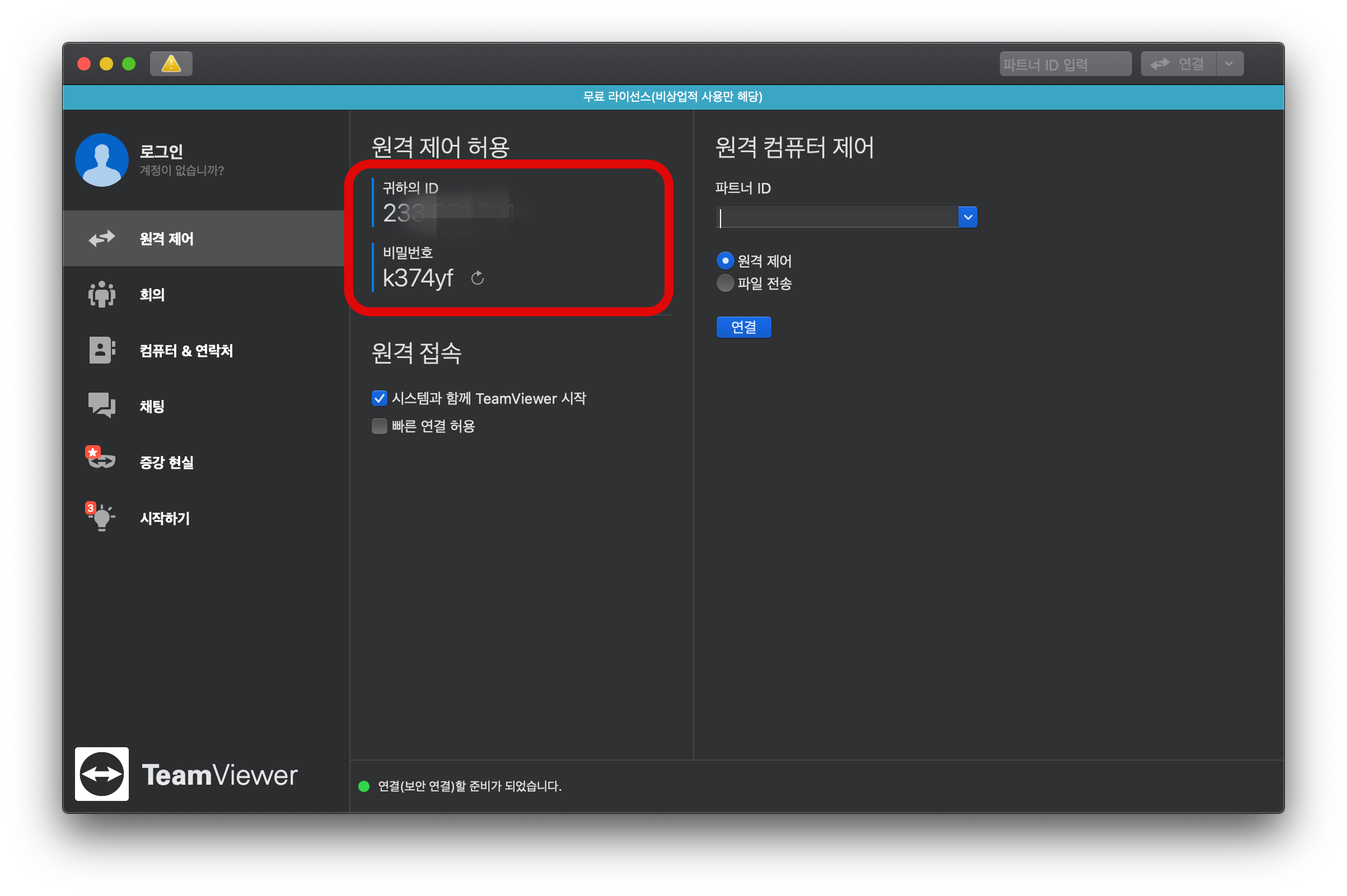 이제 정상적으로 실행된 화면입니다. 가운데 보시면 이 컴퓨터의 ID가 보이고 밑에 비밀번호가 나옵니다