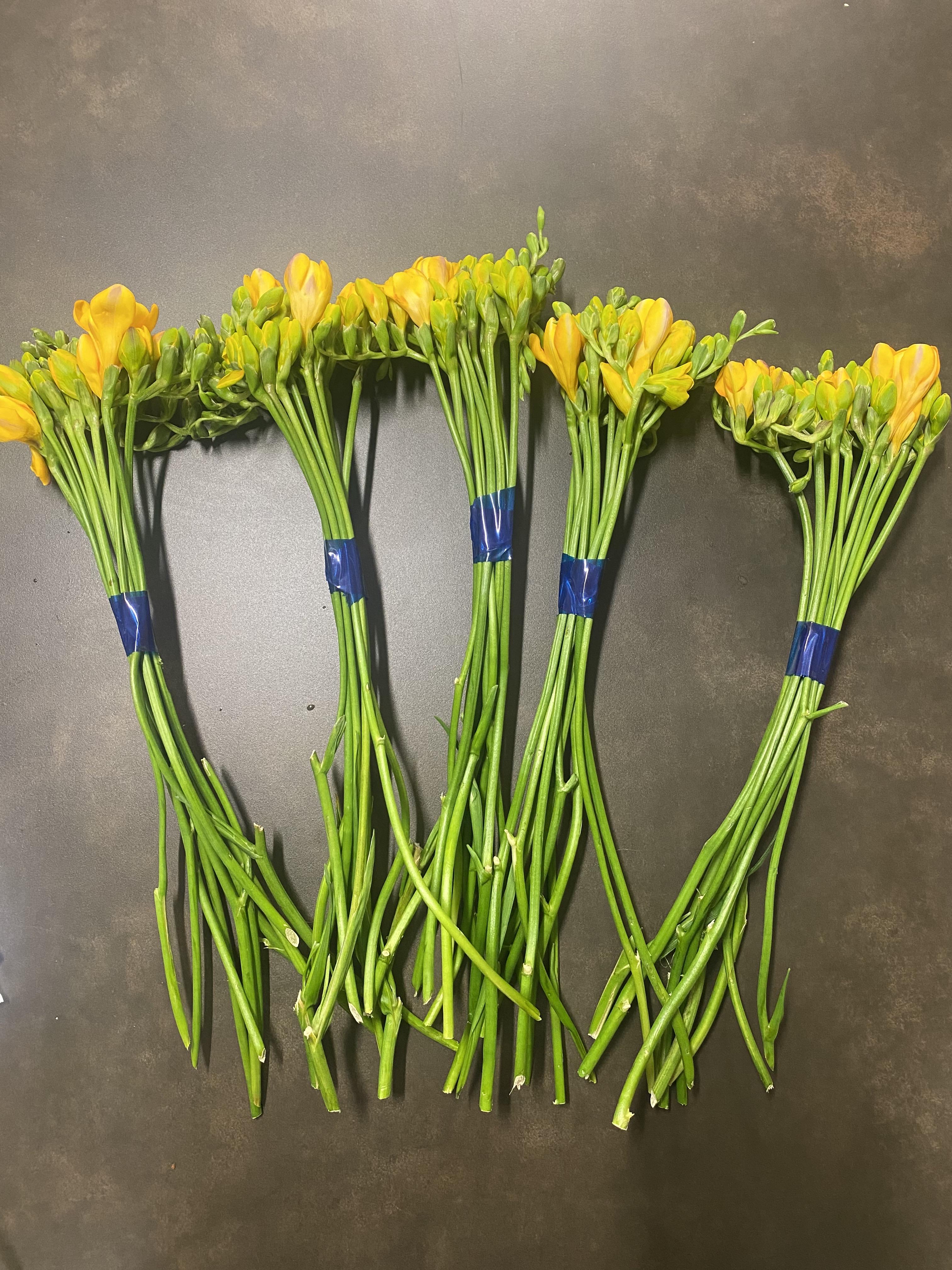 한단에 후리지아 줄기 10개씩 묶여 있습니다.