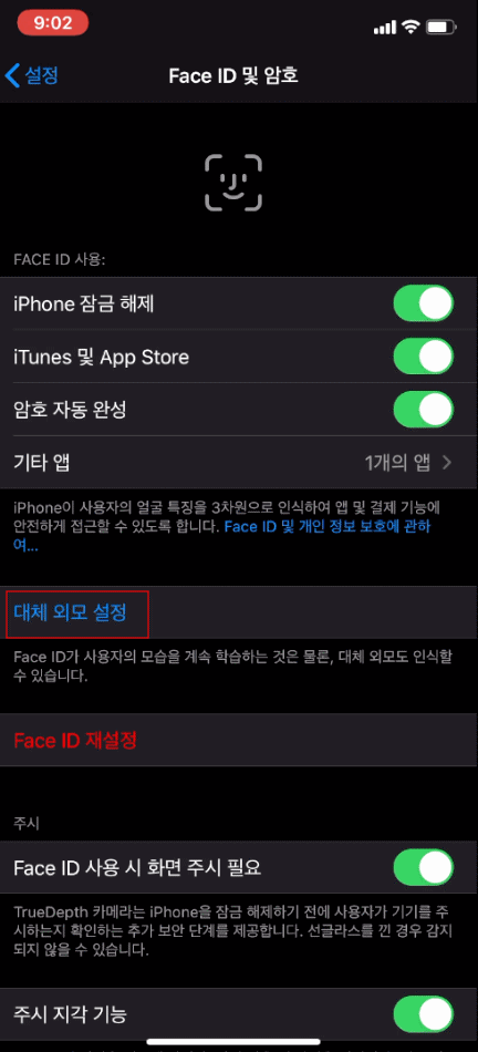 [대체 외모 설정] 기능을 누르시면 가능하세요. 방법은 위의 [Face ID 설정] 과 동일하지만,