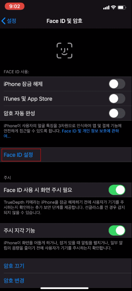 암호 입력을 하신 후 이미 등록된 Face ID 를 초기화하기 위해 [Face ID 재설정] 을 눌러줍니다.