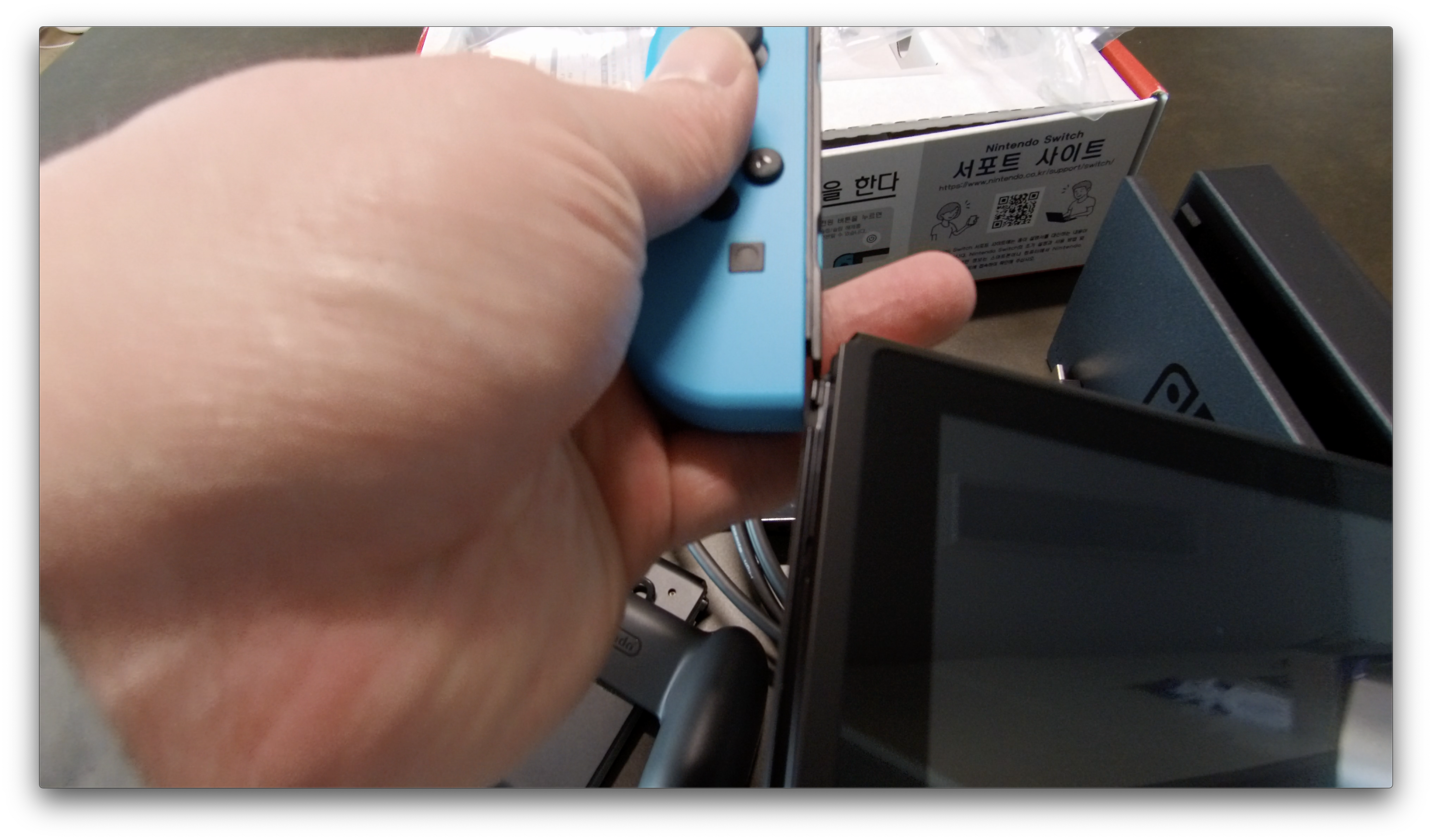 실행을 위해 결합을 진행합니다~ 조이콘을 위의 사진과 같이 위에서 아래 방향으로 홈에 맞춰
