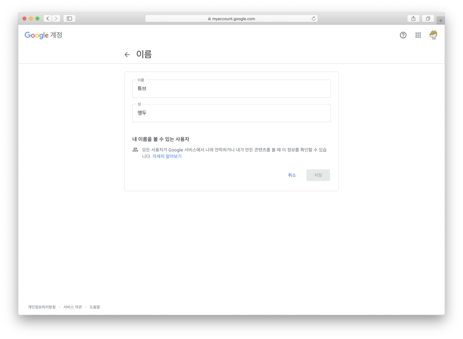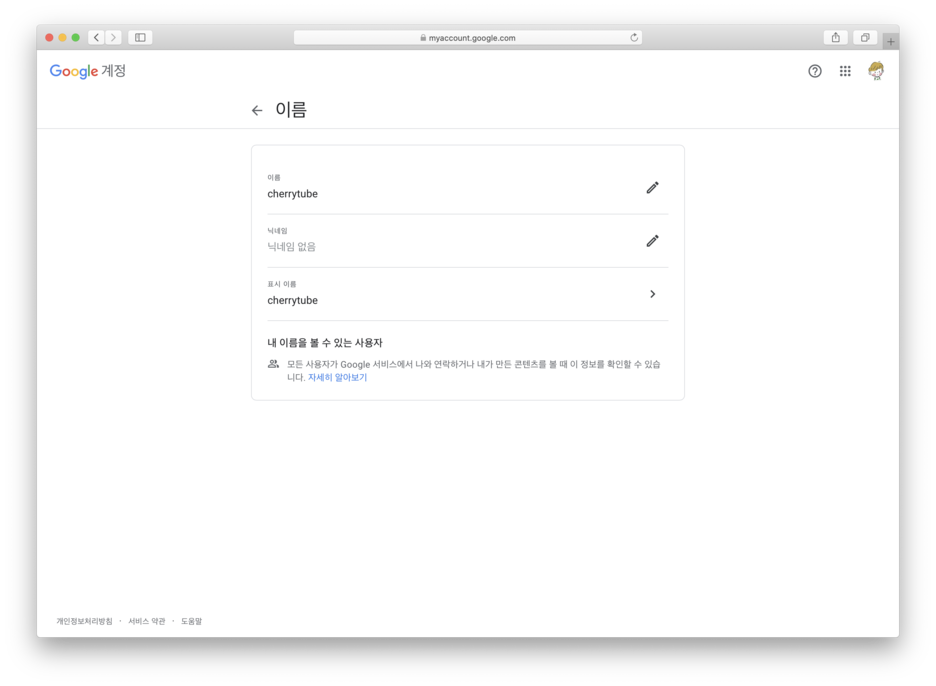 요렇게 앵두튜브로 되어 있던 계정의 이름 정보를