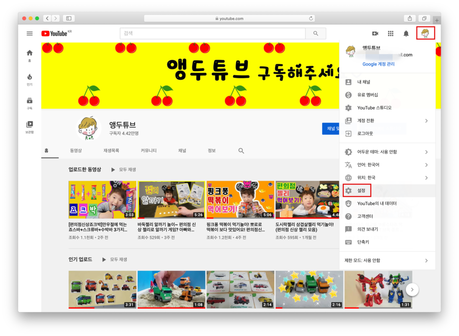 좌측의 메뉴 중 [계정] 을 선택하면 내 채널 정보 중 앵두튜브 밑에 [Google에서 수정하기] 라는