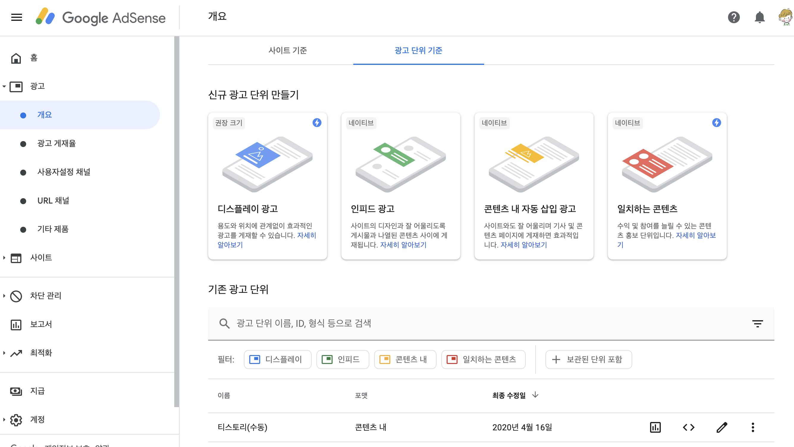 보시는 것 처럼 [광고 단위 기준]이라는 탭이 있습니다. 이곳에 들어가면 4가지 광고 유형이 나오는데요...