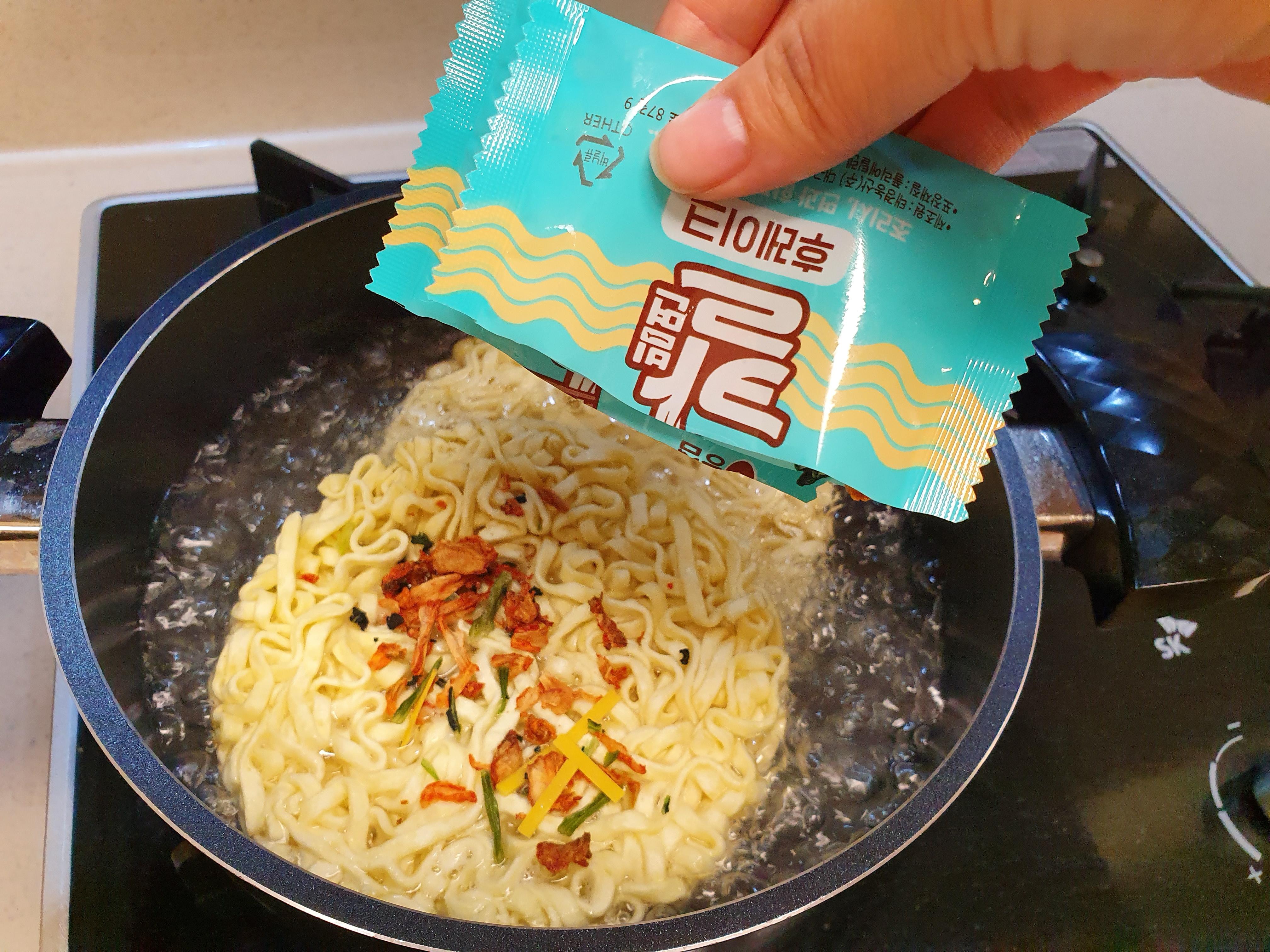 면발이 굵어서 양은 더 적게 느껴지고요. 중간중간 씹히는 김치 후레이크와 굵은 면발이 잘 어울리는거 같습니다.
