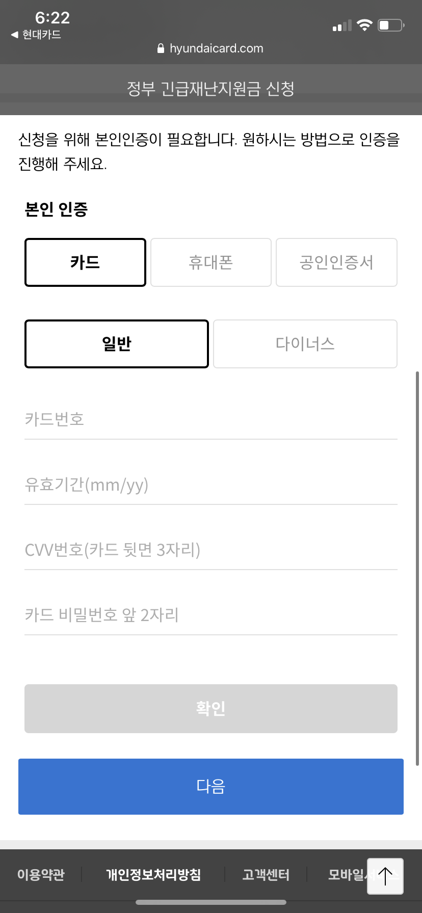 신청에 앞서 본인 인증 절차를 거치게 됩니다. 저는 휴대전화 인증으로 받았어요~