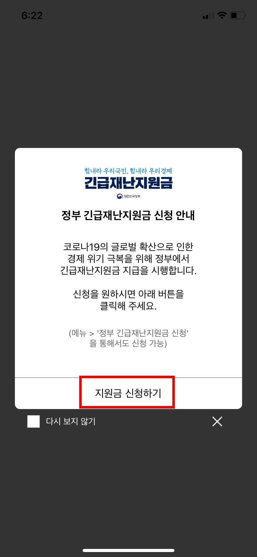 앱을 실행시키면 바로 팝업으로 '긴급재난지원금 신청' 에 대한 안내를 도와줍니다.