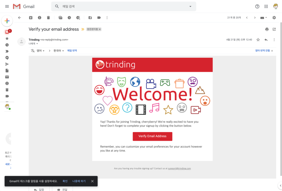 요렇게 말이죠~ 가운데 보이는 verify Email Address 를 클릭하시면 간단히 가입이 완료됩니다.