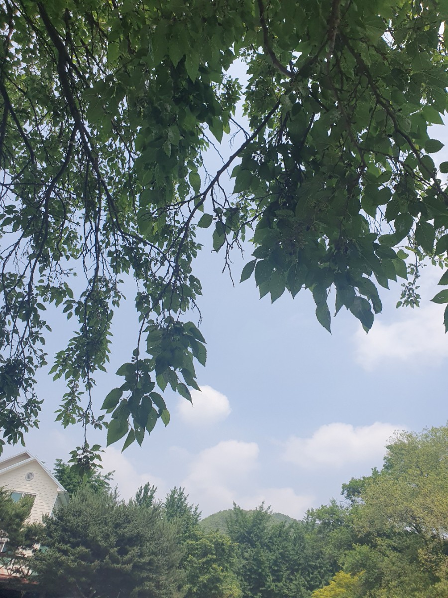 카메라에 지문이 묻어서 조금 흐릿하게 나왔지만 나무그늘에서 하늘을 보고 있으니~