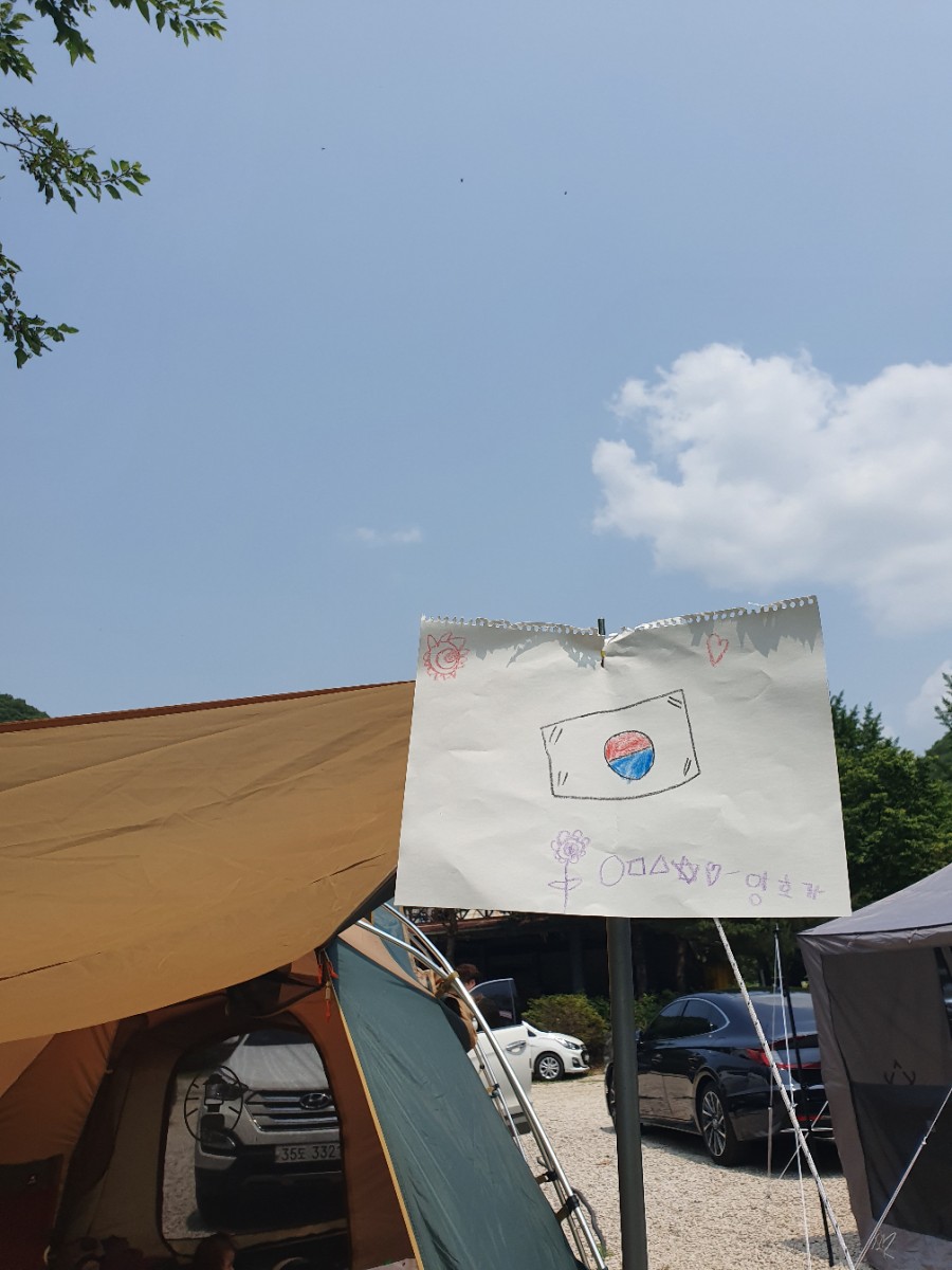 직접 그린 태극기~ 조금 서툴게 그렸지만 텐트 앞에 걸어놨답니다~
