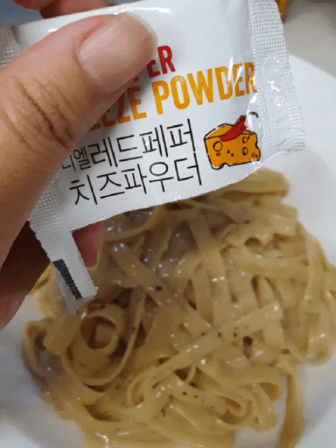 처음에는 안 뿌리려고 했는데 치즈 파우더를 뿌려야 맛있어요.