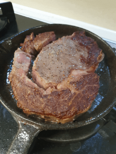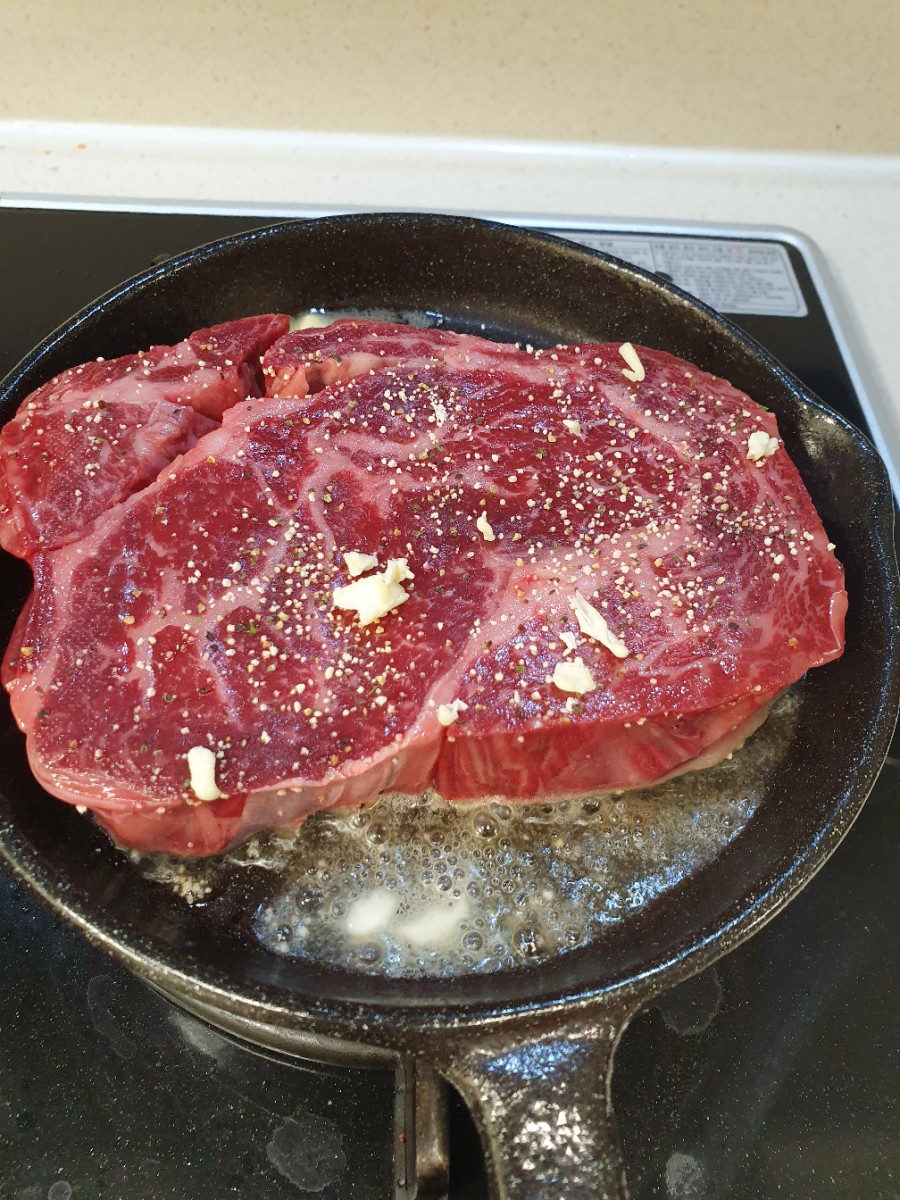 맛있게 익어가고 있는 스테이크 보이시나요?