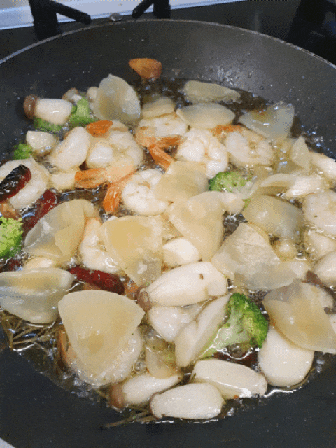 매운 향이 날 때쯤 새우와 야채를 넣고 튀기듯 끓입니다.