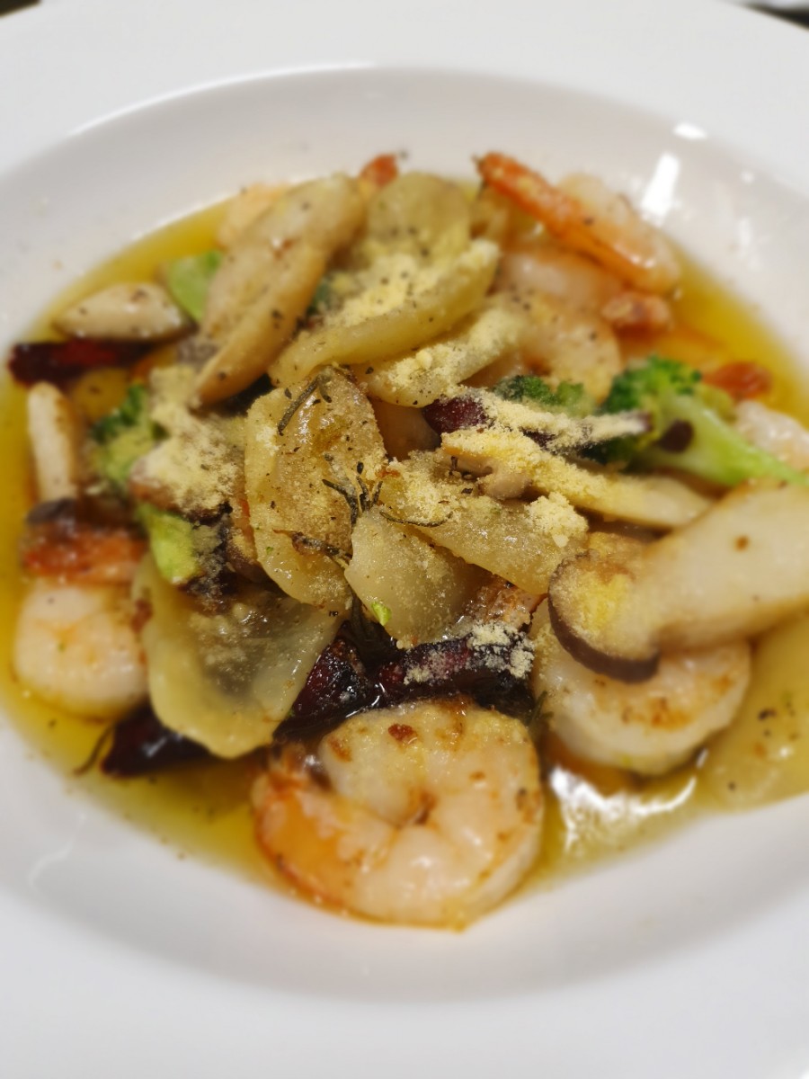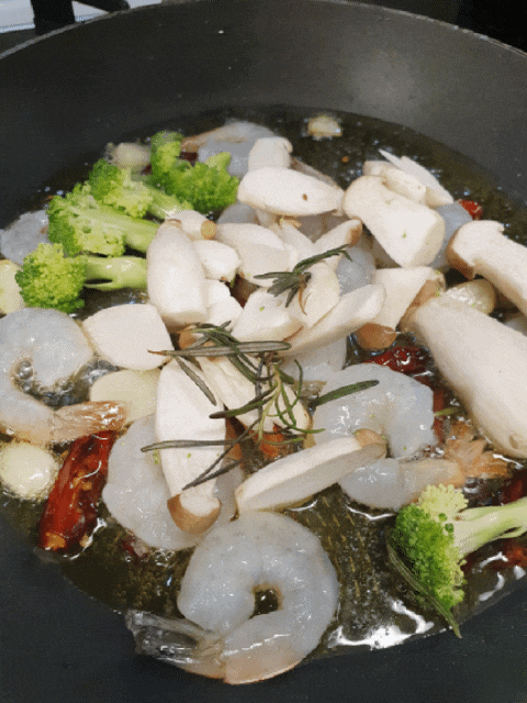들어있던 재료들입니다. 생새우, 야채들, 마늘, 고추, 수제비, 올리브오일, 소금, 파마산 치즈가 들어있답니다.