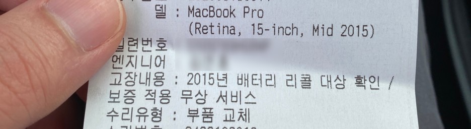 요렇게 2015년 맥북프로 레티나 15인치의 수리가 완료되어 무상 서비스 영수증까지 받았네요.