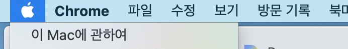 맥북 상단의 좌측에 있는 사과 버튼을 누르시면 바로 '이 Mac에 관하여' 메뉴가 보이세요.