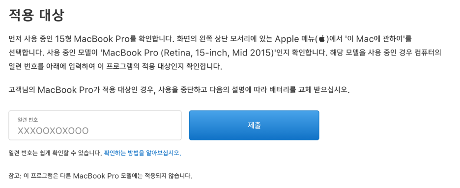 중간에 있는 요 텍스트 상자에 본인의 맥북 일련번호를 기입하시고 '제출' 버튼을 누르시면 바로 알려줘요.
