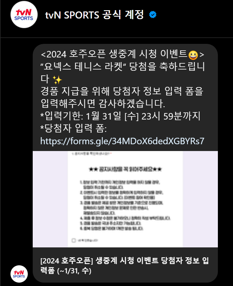 위 인스타그램 링크를 접속하면 위와 같은 이미지를 볼 수 있다. 인스타그램을 통해 스포츠채널 tvn스포츠에서 요넥스와 손잡고 호주오픈 생중계 시청 이벤트를 진행했다. 이때 마침 코로나에 걸려 재택근무를 하는 기간이라 관심있던 테니스 생중계를 본방으로 사수하고 콘텐츠를 작업해서 업로드하여 요넥스의 퍼셉트 라켓에 당첨되는 행운을 맞았다.