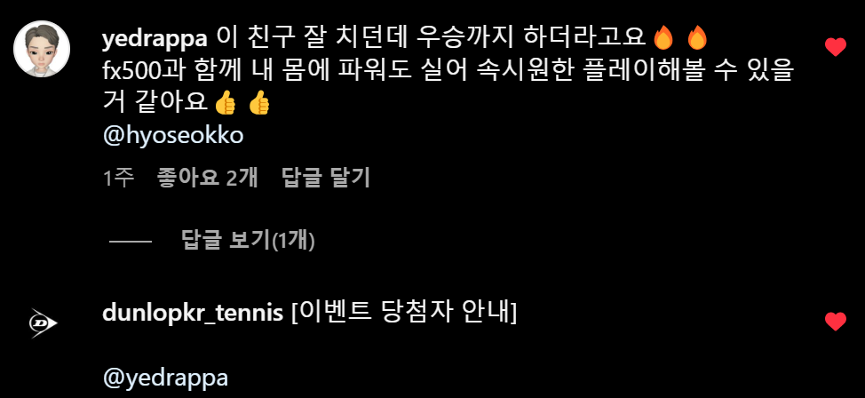 위와 같이 당당히 댓글에 내 계정 @yedrappa 가 이벤트 당첨자로 안내가 되었다. 댓글 하나 작성하고 팔로우와 좋아요 하나 눌렀을 뿐인데, 역시 정가 기준 32만원 상당의 잭 드라이퍼 선수가 사용하는 역사와 전통의 헤리티지 브랜드 던롭의 FX500 모델을 받게 되다니...감격스럽다.