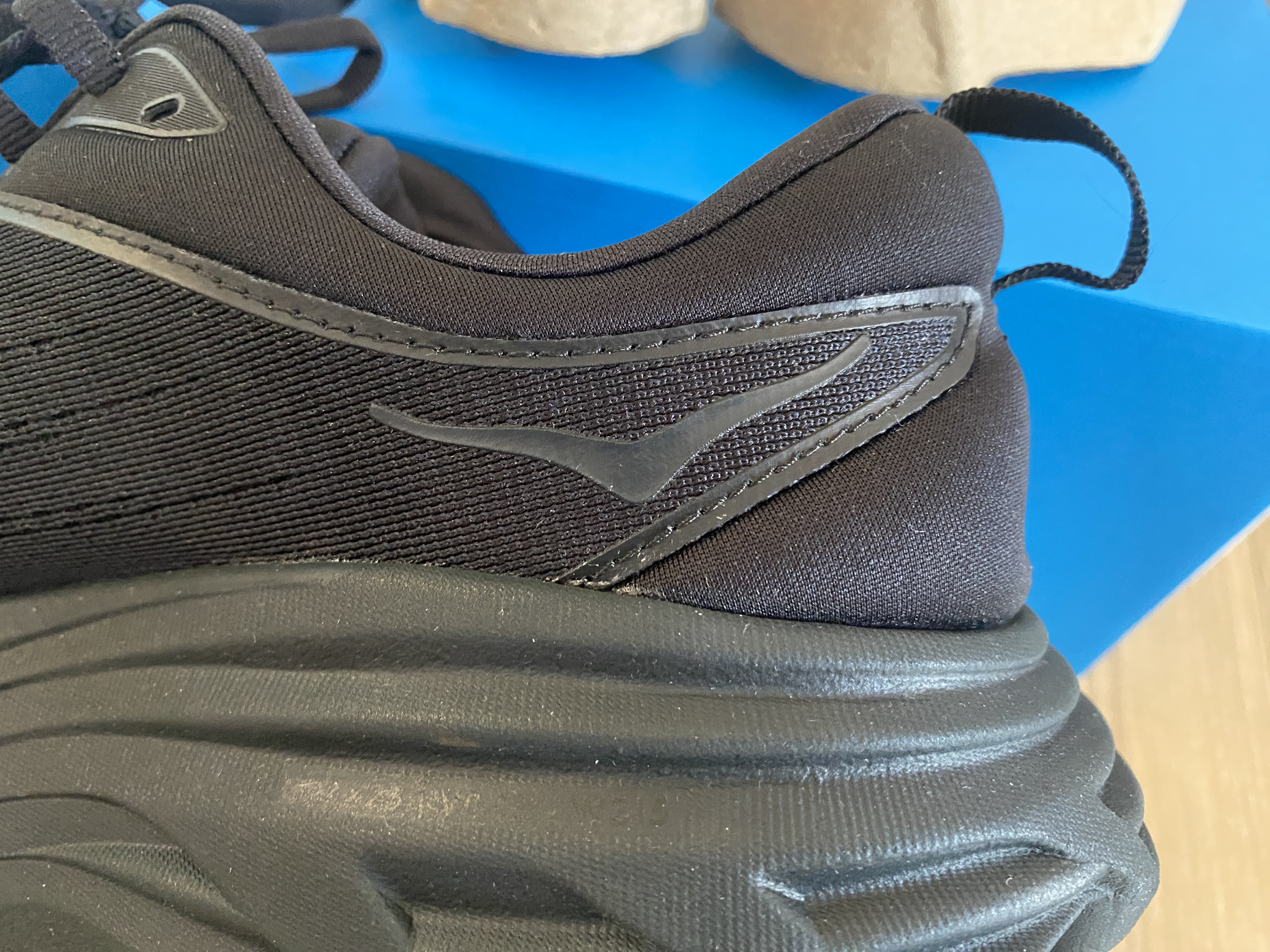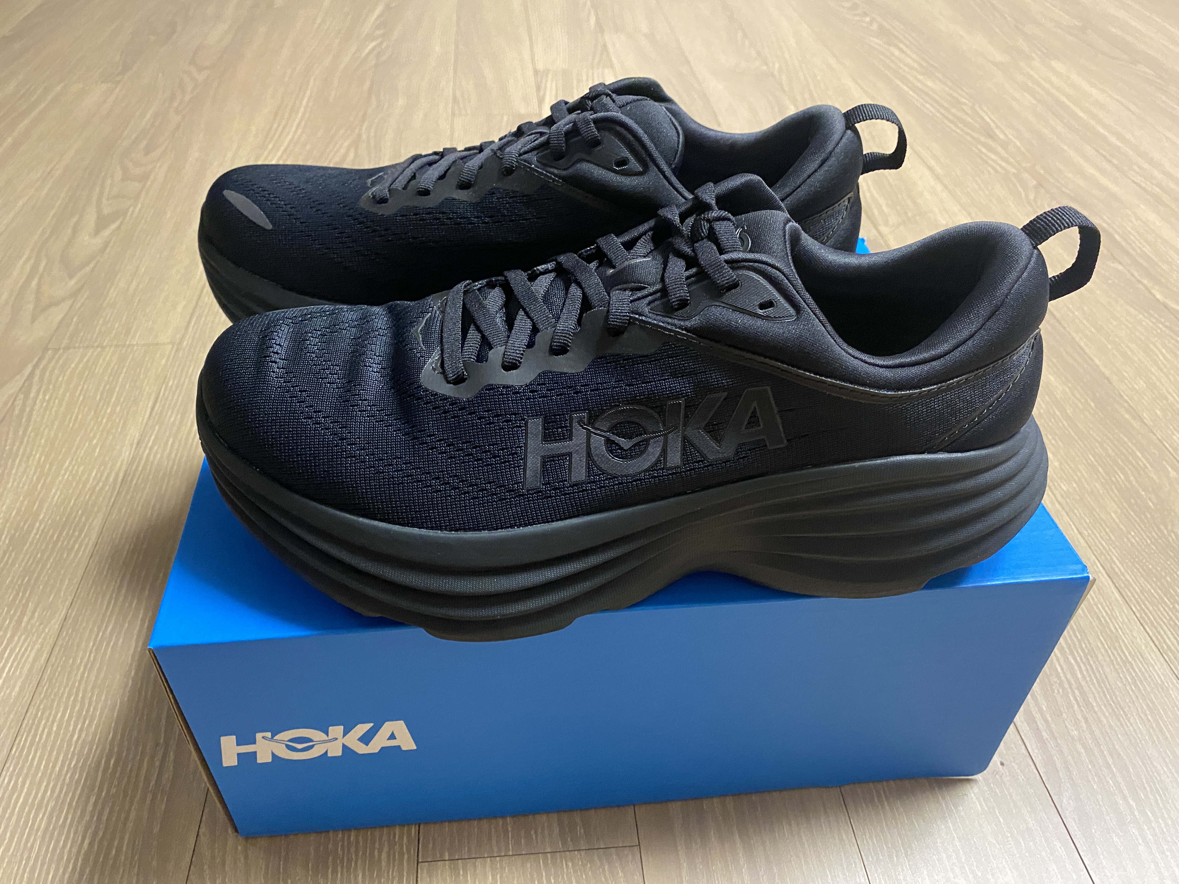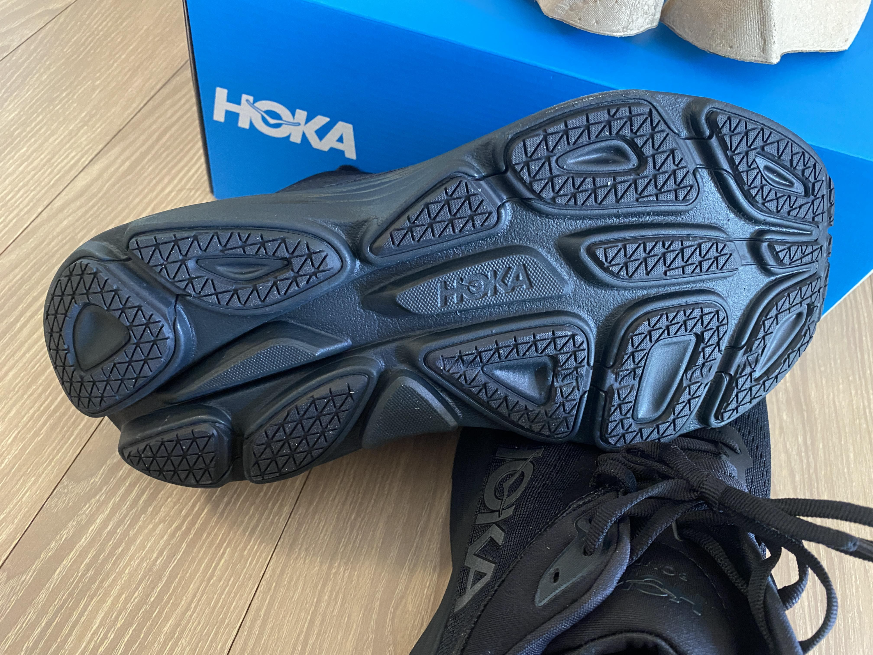 엠포인트몰에서 구매해 실제 받아본 본디8 와이드 신발은 곳곳에 호카의 새모양 로고와 레터링이 있었다. 올블랙이라 튀지도 않아 회사 다닐때 신기도 이상하지 않았다. 런닝화라고 화려한 신발들이 많았는데 올블랙의 매력이란...다만 이 제품은 병행 수입 제품이라 A/S 등은 안되는거 같다. 그리고 매장에서 신어본 쿠셔닝이 느껴지지 않는 기분은 왜일까...